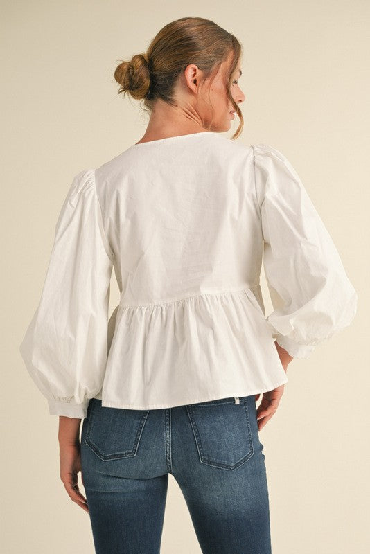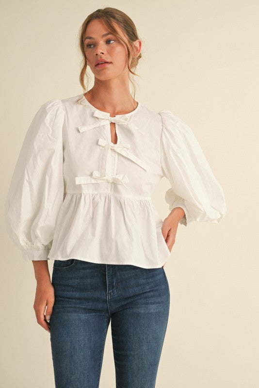 Bow ties peplum top with U-neck, three quarter balloon sleeves, and band