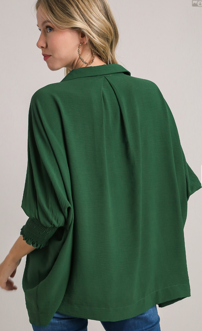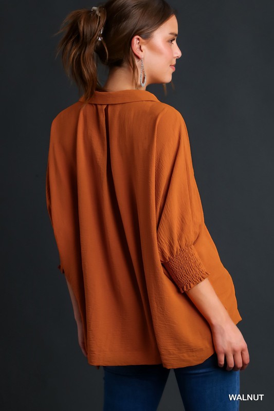 Solid Collared 3/4 Smocked Sleeve Swing Top