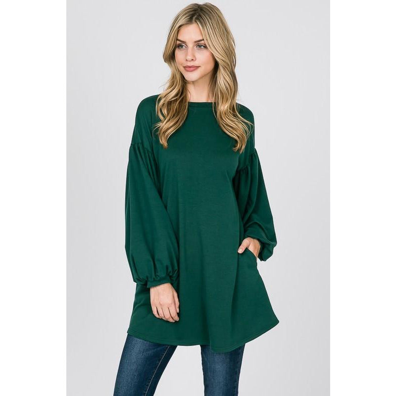 -Long bubble/puff sleeve -Round neckline -French terry -Side pockets