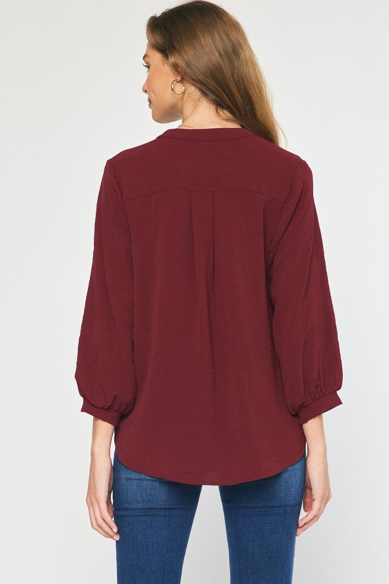 Solid V-Neck 3/4 Sleeve Pleat Back Top