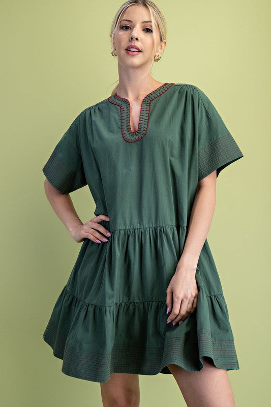 Tiered Slit Neck Mini Dress with Embroidery Details Model is 5'7" wearing a small.