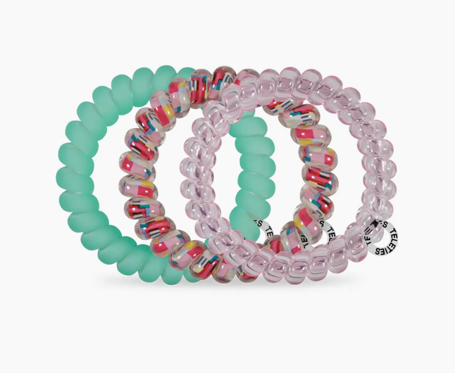 Spring Splash Large Hair Ties in Green and Pink offer a strong grip without damage, doubling as a chic wrist accessory when not in use. Your new favorite hair essentials all year round. Strong grip, no rip design for all-day hold Doubles as a stylish bracelet Durable and waterproof for all occasions Gentle on hair—prevents breakage, headaches, and creases Sold in packs of three.