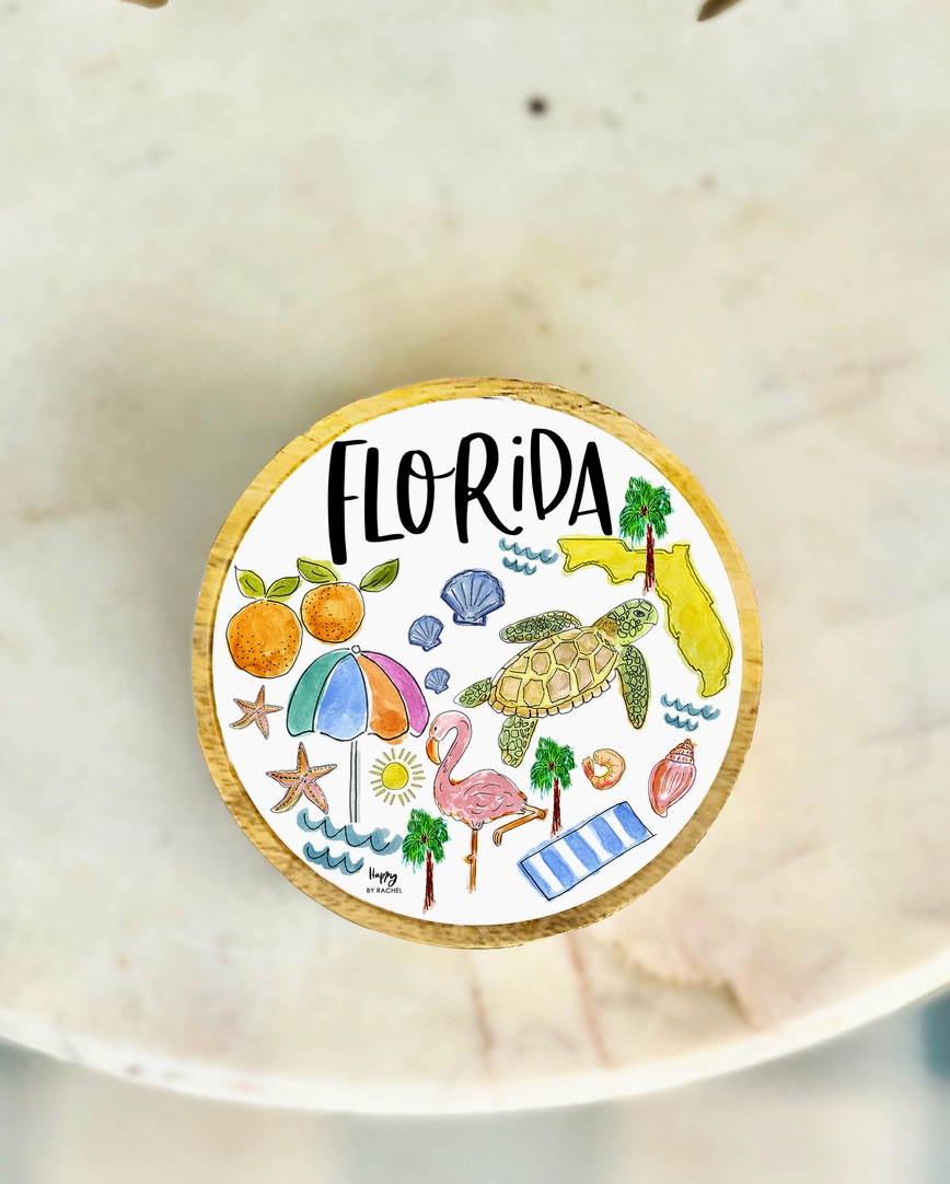 Our State of Florida wood and enamel tray is perfect for your home! A mango wood and enamel trinket tray-measuring 5"-features artwork by Rachel Walker that showcases all the iconic things that makes FL so special!