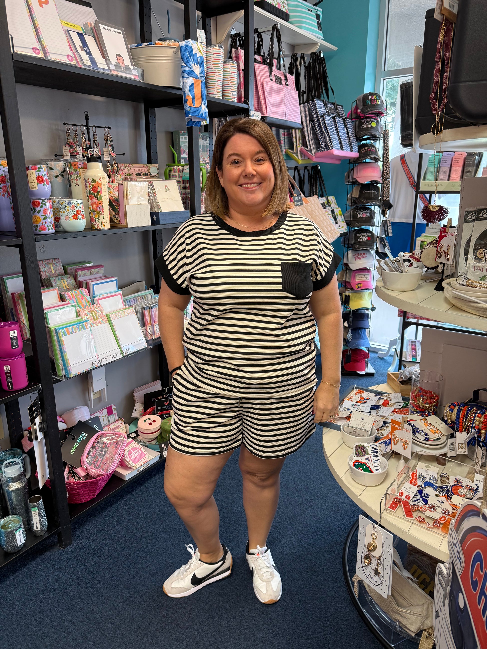 Striped Contrast Pocket Shirt & Shorts Set-Blk/Wht